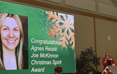 Also, just as we navigated getting off the freeway I received a phone call (that I sadly had to ignore, cause, well, I’m driving) from the President of Independent Brokers of Spokane and within minutes a text popped up with a giant headshot of me on a big screen. I won the Joe McKinnon Christmas Spirit Award! So, incredibly, awesome. (I don’t have sufficient Wifi to upload the video to give insight as to why I am getting the award, so for now here is a pic.)