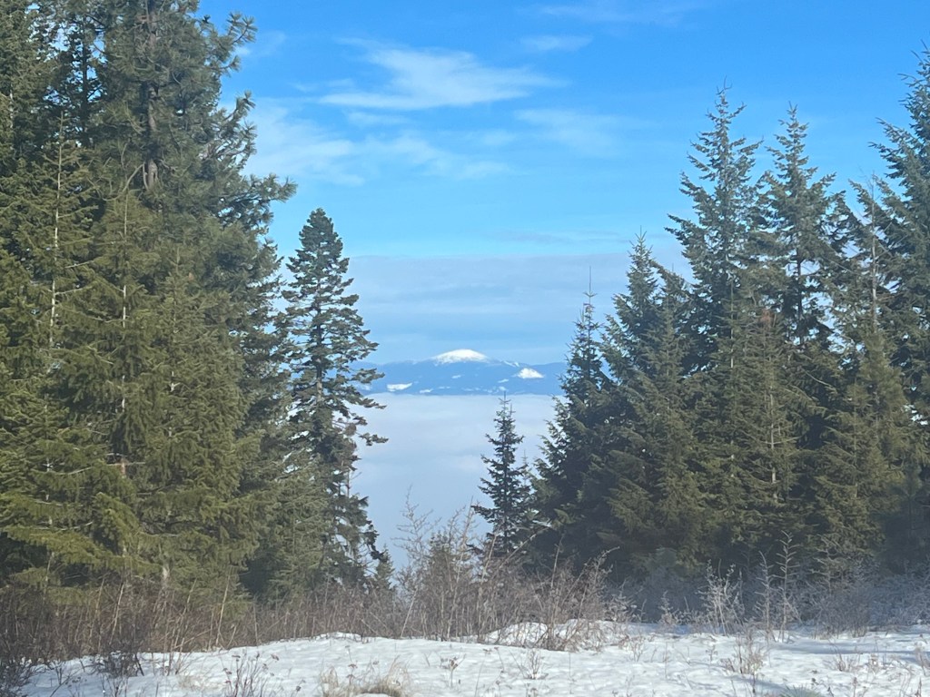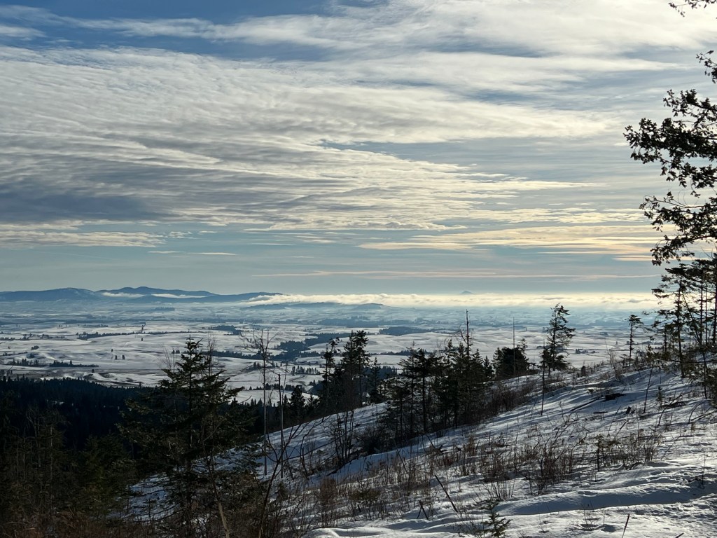 So. About ending up on the wrong trail 3 times over… First was when David misunderstood which way I wanted to connect up to the WTA route. I didn’t want to go the way he started taking us cause the ridge that connects up is narrow and steep and I just didn’t feel like navigating that in snowshoes and having to side hill and all that hassle. Second was when David was like “this is the trail” and I’m like “really? right through groves of larches?” AllTrails app got off course cause of the cloud layer so we just made it our lunch spot and had great views of Mount Spokane. The third time was David swearing that taking the “road-road” back down would be quicker than the trail we came up on. Except. It didn’t. Cause we missed the cutoff. So, our navigation skills were sub par, but our longer than planned adventure was fantastic.