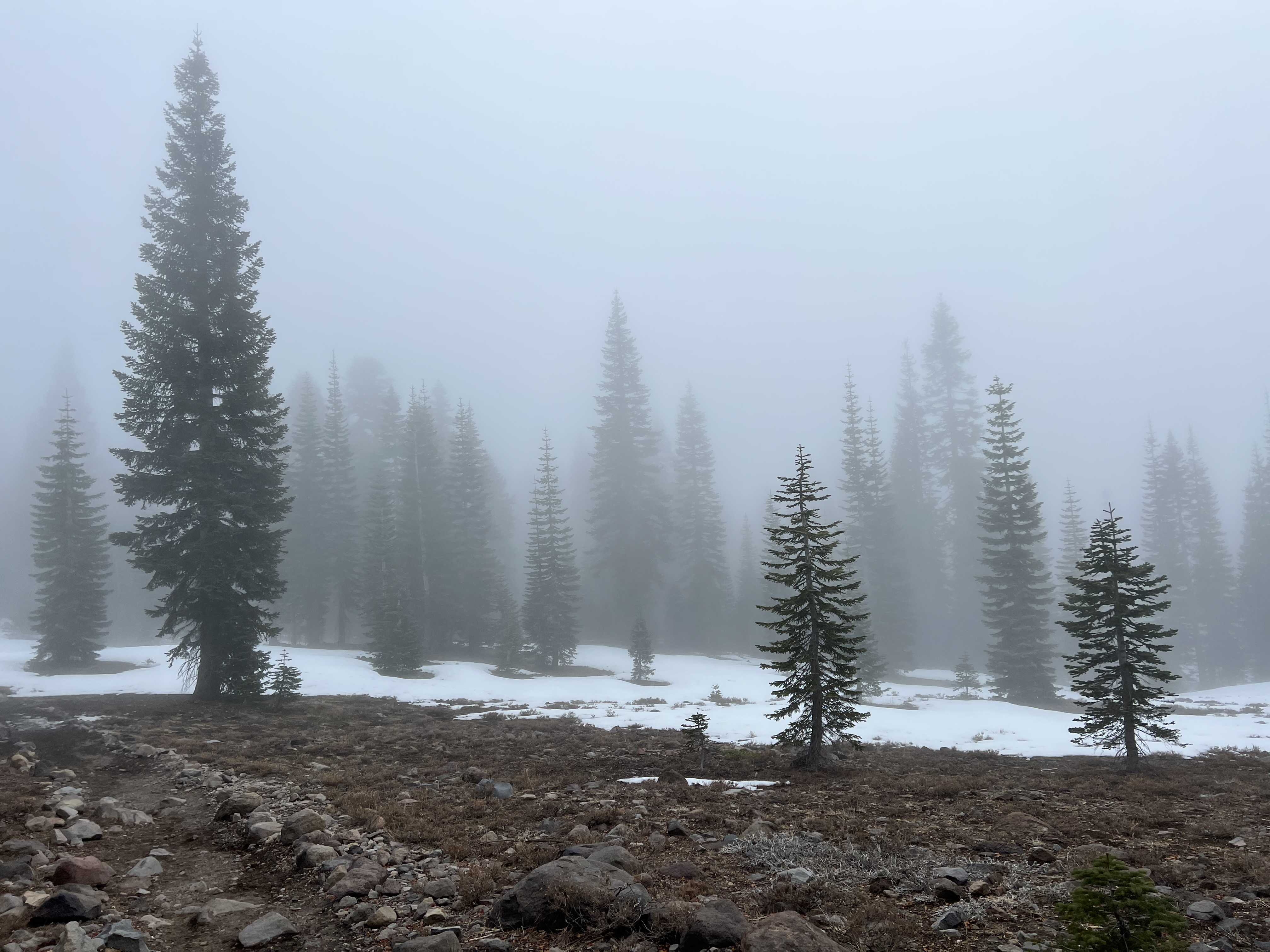 The town of Mount Shasta was completely socked in with fog and clouds and everything looked quite wet. You simply couldn’t see the mountain. The night prior, poor David had his own meltdown about selecting a hike for us. By morning it was a rather simple decision for me on where to go: can’t see the mountain, so let’s go step on it! Plus, I’ve never been on it—my three previous hikes in the area took me away from it and had me looking at Mt. Shasta from a distance. Before we set out we stopped at the Ranger Station which turned out to be closed, but there was a number we could call. The Ranger said that hiking at Castle Crags would be best. Definitely not Black Butte cause of slippery rocks and he didn’t seem to think hiking the trails on Mt. Shasta would be worth it. But I’m a rebel and I did not listen to the Ranger (not that I didn’t value his advice and recommendations). I simply wanted to set foot on Mt. Shasta! David was not about to risk another temper tantrum so we took off to the Bunny Flat trailhead.