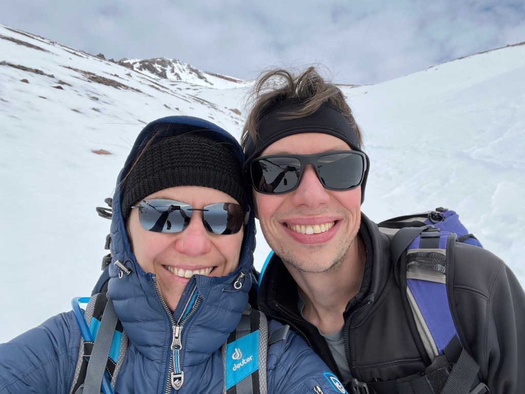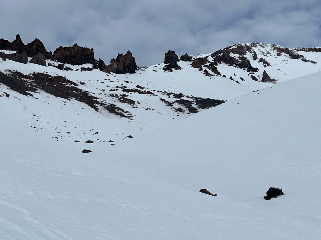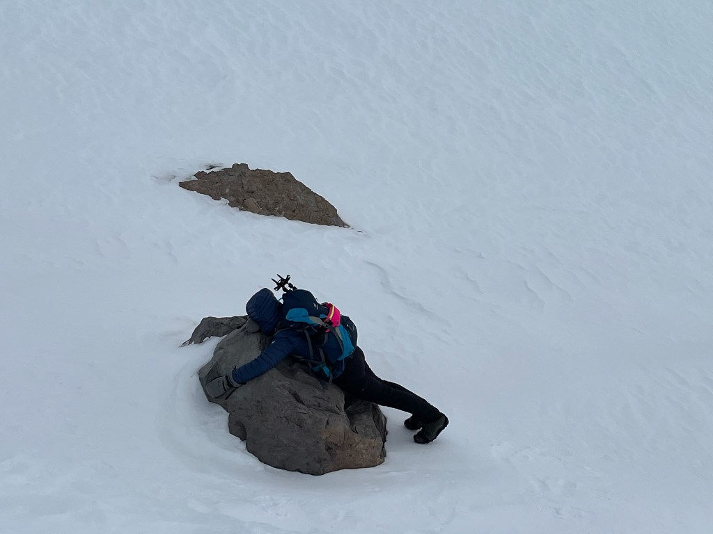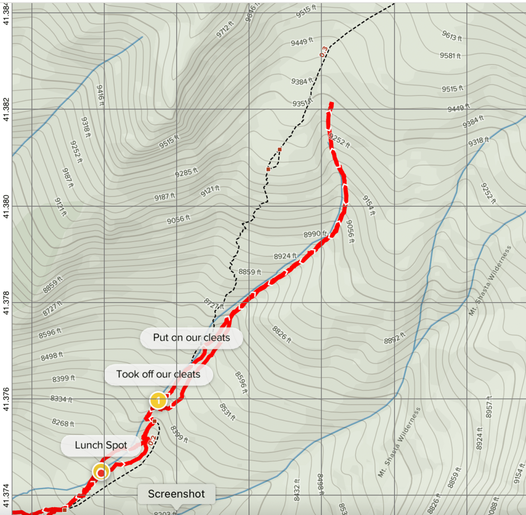 David tells me that those summiting go up the slope to the right of the “heart” then a slow slog up to the left which is Misery Hill then above, over, and beyond is the summit of Shasta.
