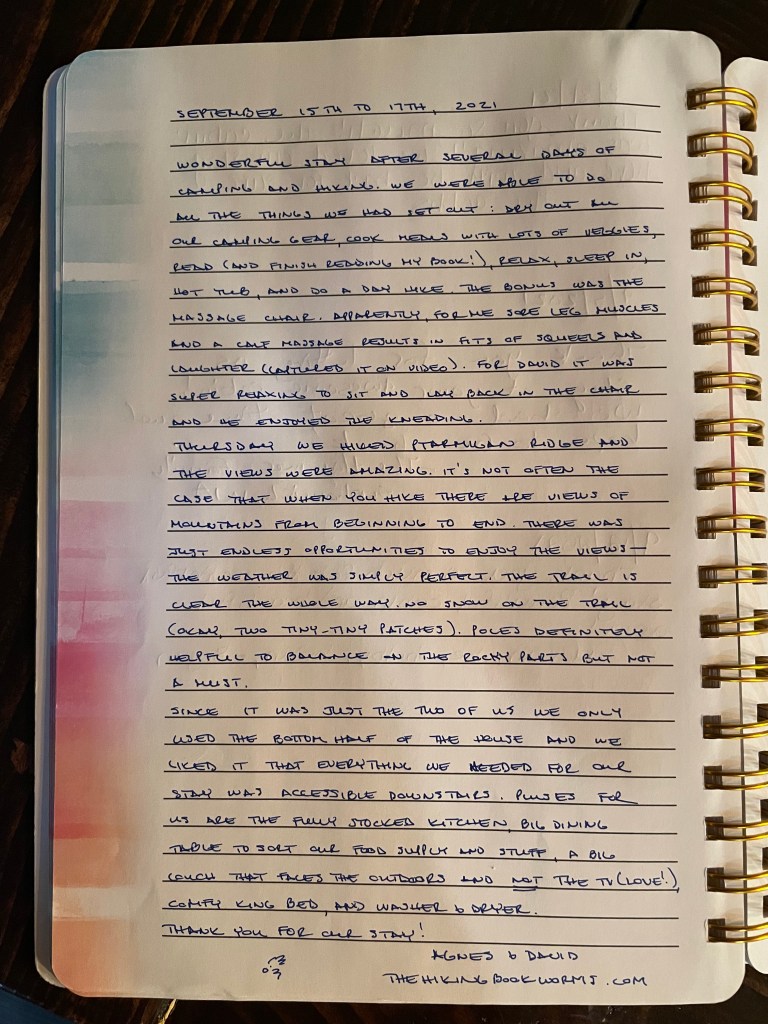 Hiking recommendation: Ptarmigan Ridge. The views are fantastic from beginning to end and you go about as far as your feet can take you. Trailhead is about a 45 minute drive from the cabin and Forest Pass required or $5 day use fee.