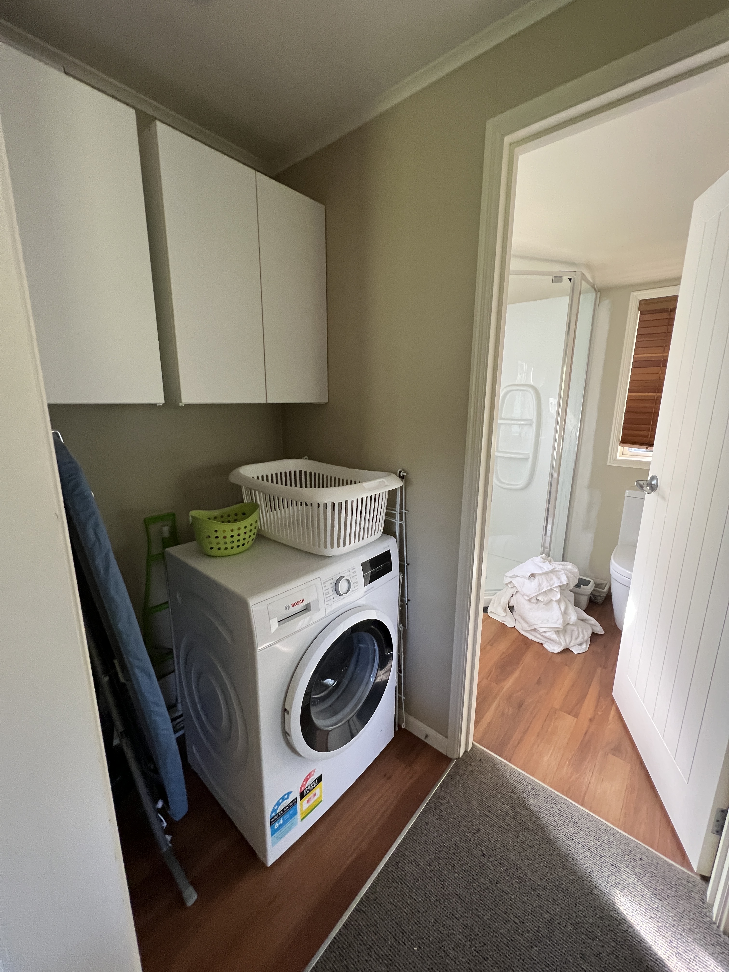 The bed is nothing special, but it’s adequately comfortable. We slept well. It’s lovely to have a washing machine. The bathroom is brand new and has plenty of storage and counter space. The shower is okay but quite small. It’s very easy to bump your elbows in there, and if that bump happens to knock a body wash bottle off the shelf that’s right at elbow height, this can require a trip to the emergency room to ascertain if one’s toe is broken (personal experience!). The water temperature is quite variable. On a warm setting it will slowly trend to very hot, then sometimes unexpectedly go cold. It seems like the hot water might be a whole-house on-demand system that sometimes switches off for some reason.