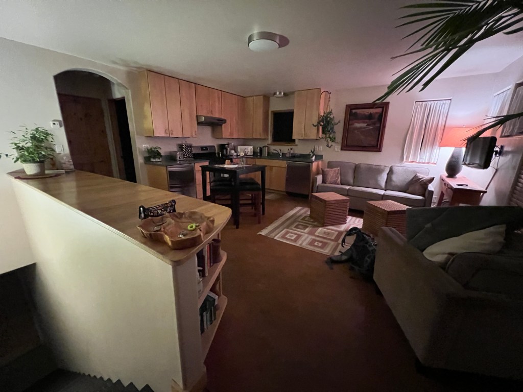 The countertop space above the staircase is FANTASTIC for staging, arranging, and organizing gear, duffel bags, and tote boxes. (We are road tripping with a mix of camping and VRBOs so got lots of stuff with us.) Made great use of that countertop. (If only if I’d been smart enough to put our pillows there then we wouldn’t have left them behind. First time that it’s ever happened.)