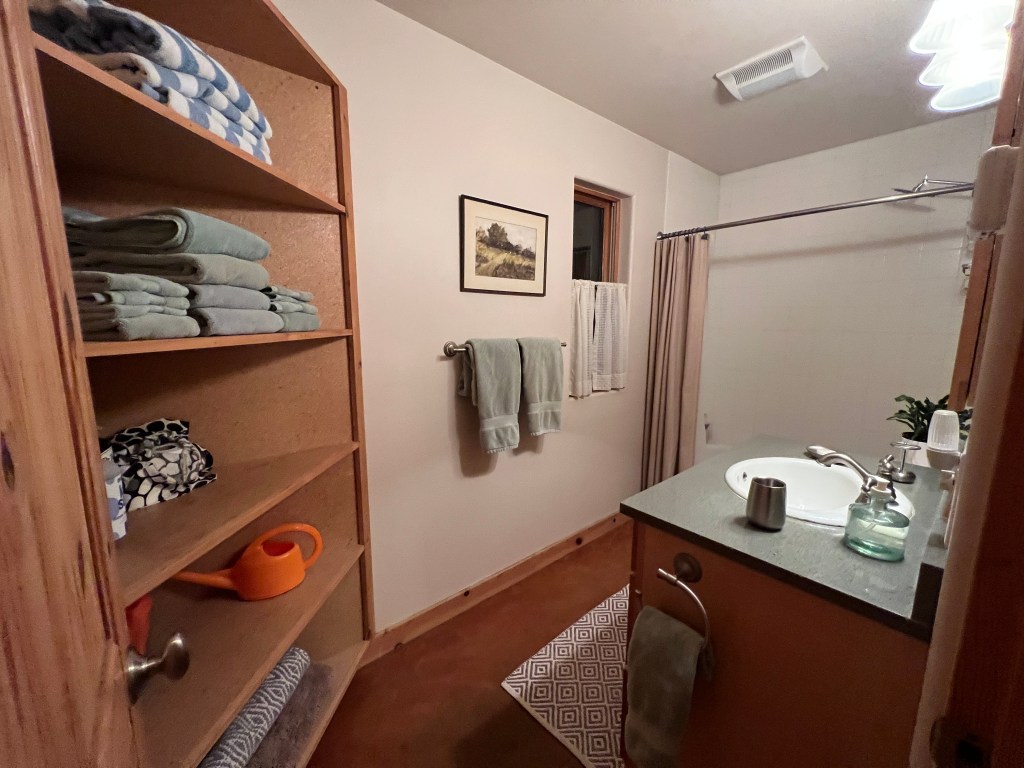 Oh! Okay, the one thing in the bathroom that we would change. We would put up a darker curtain. I don’t get particularly squeamish about being seen naked, but it was a bit odd to have a sheer curtain that didn’t fully close. From that window people from the outside can definitely see in, especially when it’s dark and you’ve got the lights on inside. I fixed the gap by draping a hand towel over the curtain bar. Easy-peasy, but perhaps this would be the one thing I’d adjust.